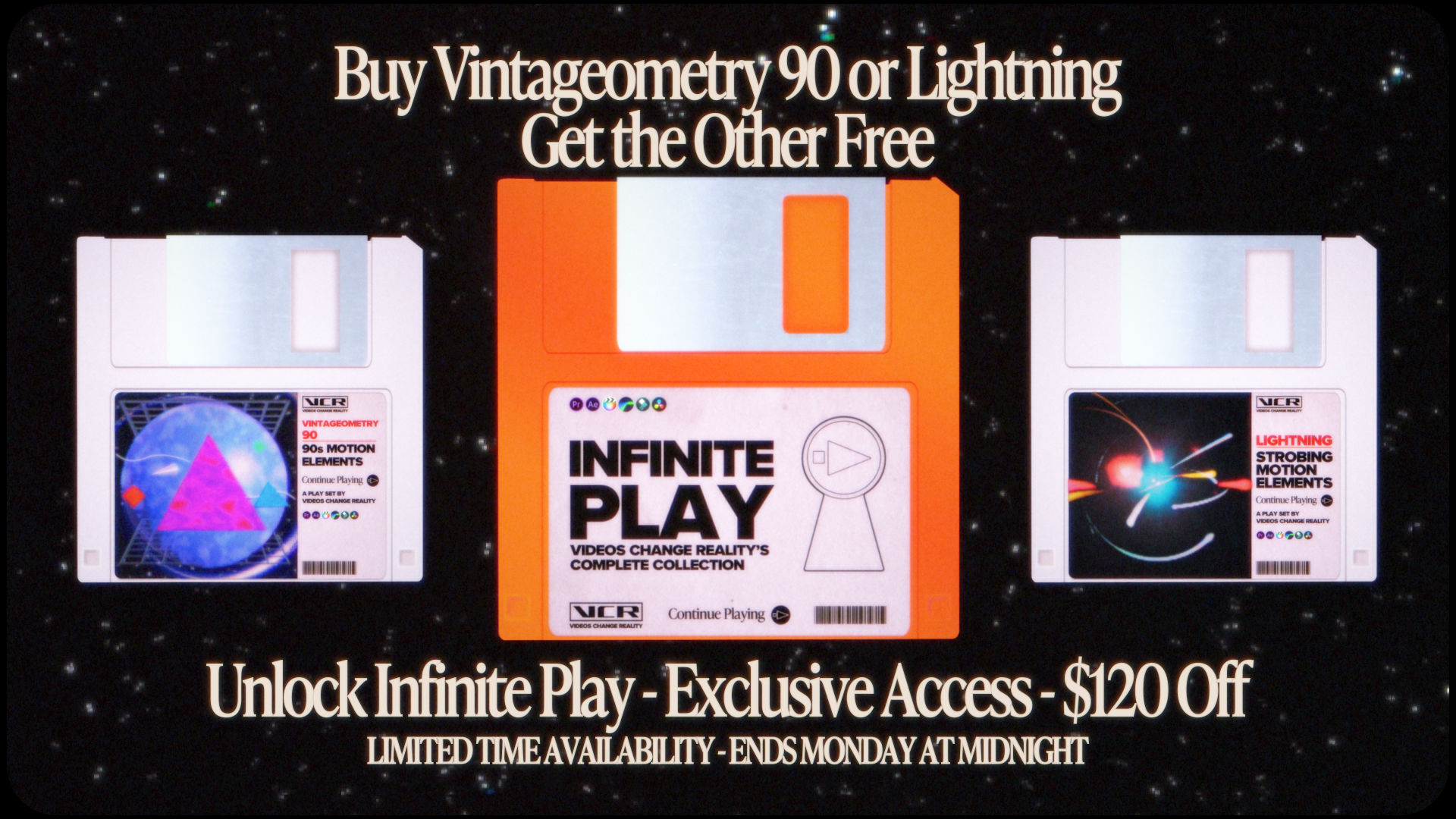 Infinite Play is every VCR asset—motion, texture, sound, and color—curated into one timeless archive. One click, one download. Access every current and future Play Set and keep your focus where it belongs: creating.